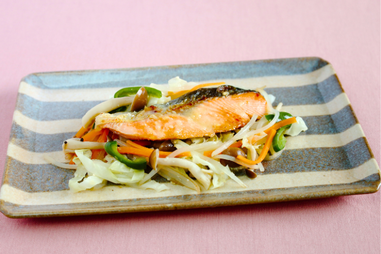 お皿に野菜を敷き、秋鮭をのせて盛り付けます。
